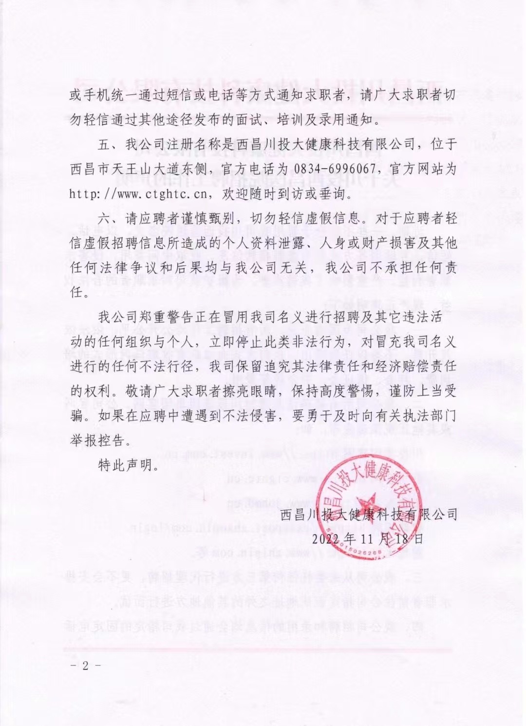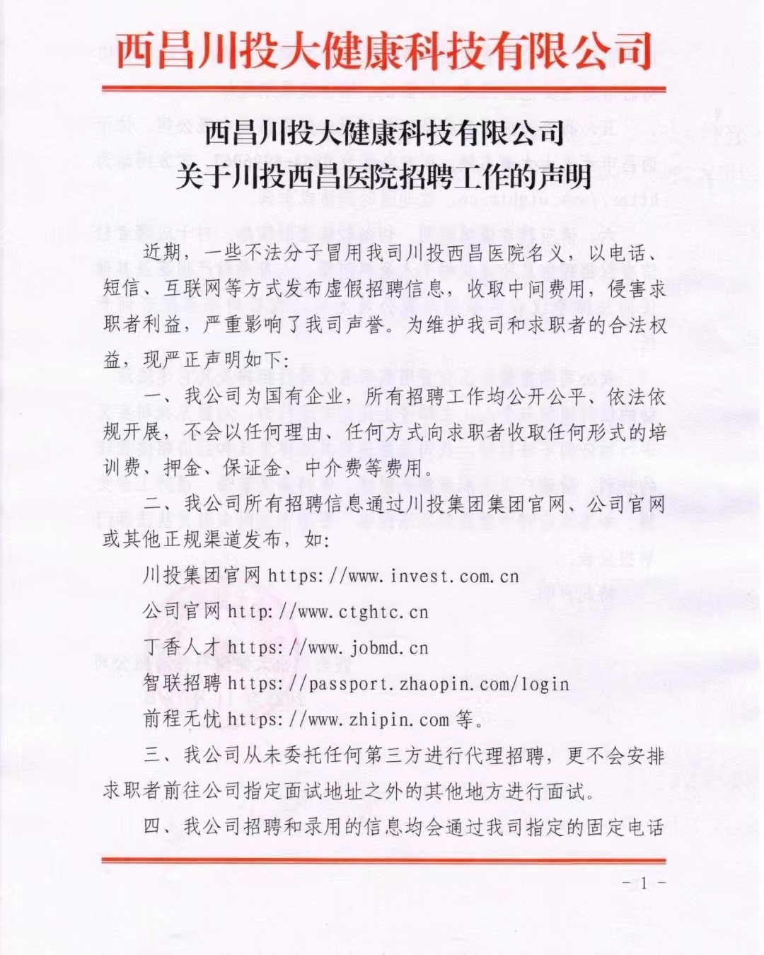上一條:西昌川投大健康科技有限公司關(guān)于冒充我司發(fā)布虛假招聘信息的嚴(yán)正聲明